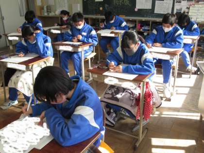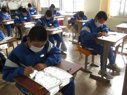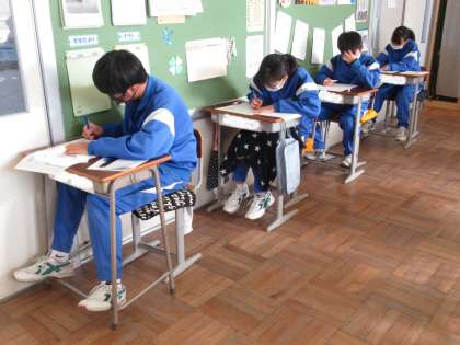 県下一斉に学力調査が実施されました。国語、社会、数学、理科、英語の5教科について取り組んでいます。緊張感が漂います。