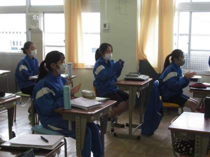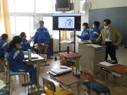 モニターの映像を見ながら、発表をしています。