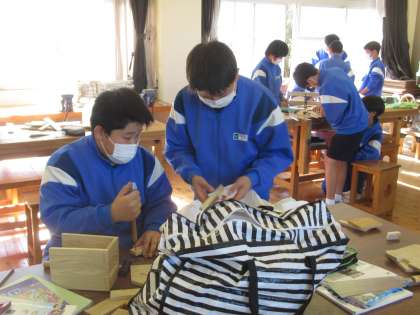 「本箱」の製作を行っています。組み立ての段階ですが、早い生徒は塗料を塗る段階に入ってきました。