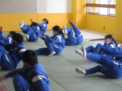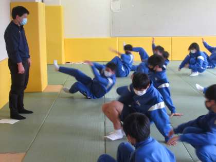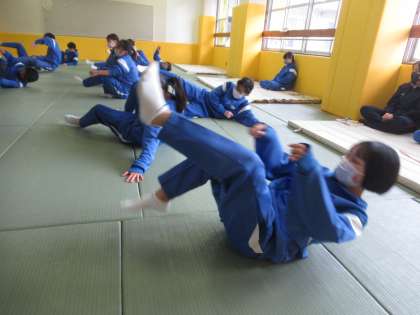 柔道を学習しています。後ろ受け身を、低い姿勢から行う場合と立った姿勢から行う場合と練習しています。