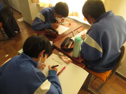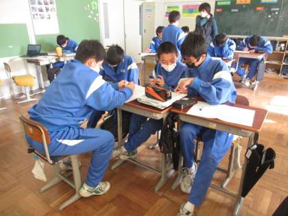 比例・反比例の単元末課題に挑戦しています。課題は、「行列のできているポップコーン売り場に並んでも、見たいショーが始まる前に買うことができるかどうかを、数学的に判断する」というものです。関数を考えるために必要な情報について考えています。