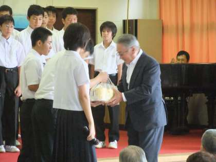 有志生徒によって組織された長井崎中学校合唱ボランティアの生徒37名が、9月14日、15日の両日「内浦敬老会」「ひだまりの郷」を訪問し、合唱を披露してきました。この日のために、校歌を含めた4曲を昼休みなどに練習し、心をこめて合唱しました。また、日頃回収している牛乳パックの収益から、トイレットペーパーを贈呈してきました。