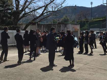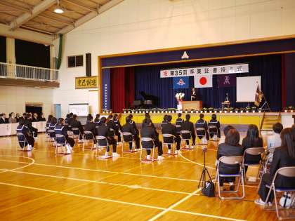 穏やかな天候に恵まれた本日、第35回卒業証書授与式が行われました。1年間学校のリーダーとして活躍してくれた3年生の卒業を、下級生、来賓、保護者、教職員全員でお祝いしました。厳粛な雰囲気の中にも、感動ある素晴らしい卒業式となりました。