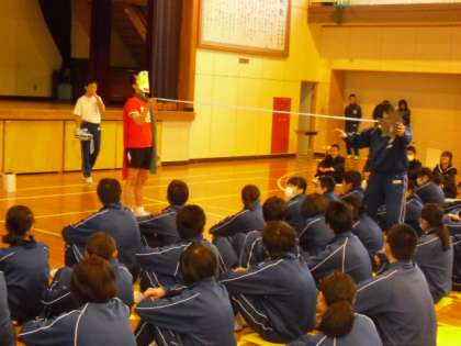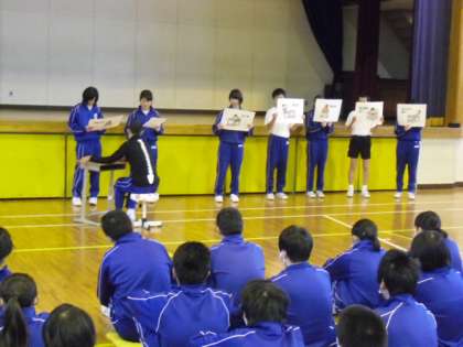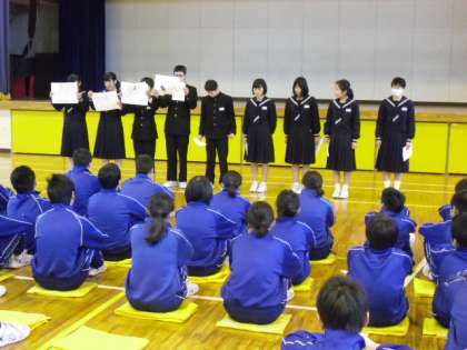 本日の朝、生徒集会が行われました。保健体育委員会からはインフルエンザ予防と正しい姿勢について、奉仕美化委員会からはチョークの再利用についての話がありました。
