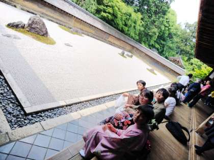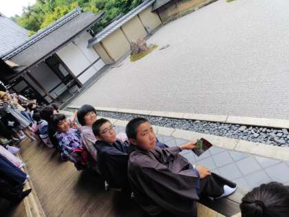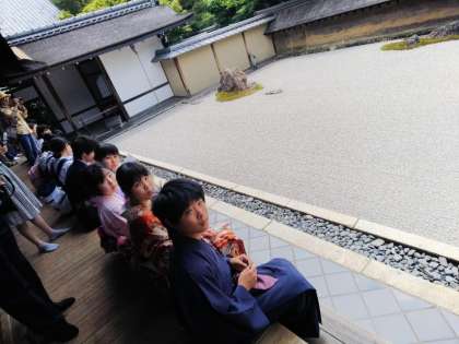 写真は龍安寺を見学している班です。さて、15個の石が見える場所は見つかったでしょうか?