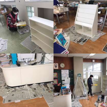 図書館の本棚を、図書館司書の先生方とスクールサポートスタッフさんがペンキできれいに塗り替えてくださいました。小中一貫学校の開校に向けて、1年生から9年生までのみんなが明るく読書に取り組んでほしいという先生方の願いが込められています。リニューアルされた新学期の図書館に、期待してください。