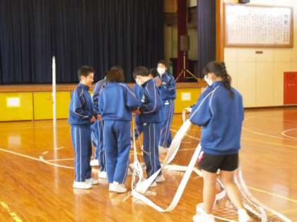 本日の保体は、バレーボールです。部活で知っている生徒もいますが、多くの1年生にとっては、経験の少ない競技です。まずは、先生の話を聞いてからバレーネット張りをします。慣れないことですが、みんなで協力しててきぱき行動できました。