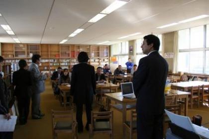 11月13日(火)本校にインドネシア救急災害医療セミナー研修員の方々が、防災教育についての視察にきました。研修員の方々は、11/4〜11/23まで全国各地を回って災害医療等についての研修を深めているそうです。本校では、防災講話、救急法講習会、DIG、ボランティア活動、3校合同の保護者引き渡し訓練、地域の津波避難訓練などの活動の様子をスライドで紹介しました。