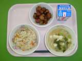 【今日の献立】 ・肉うどん ・プレーンオムレツ ・ポテトと大豆のから揚げ ・牛乳...