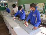 1年家庭科は、エコバックづくりです。今日の学習課題は「ポケット口を三つ折りにする」です。