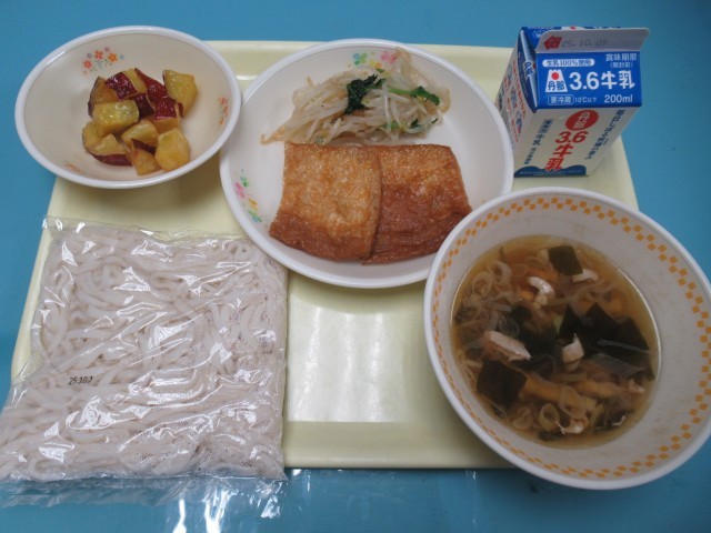 きつねうどん、牛乳、もやしの酢醤油和え、キャラメルポテト