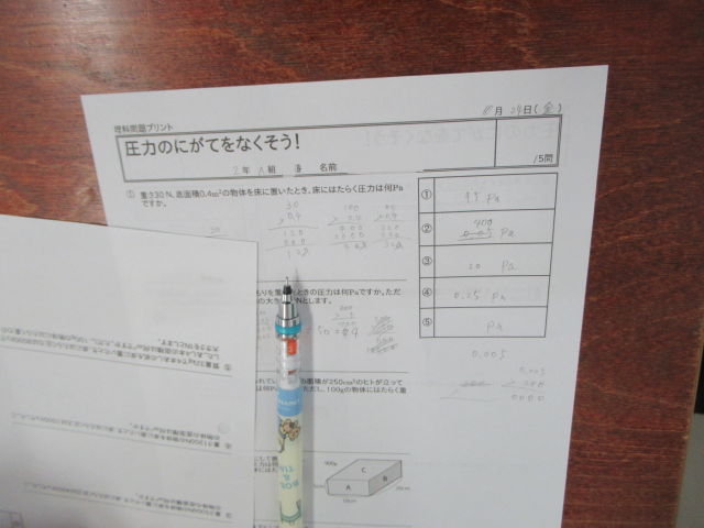 2A 理科 プリント「圧力のにがてをなくそう!」を使いながら、様々な問題に挑戦していました。