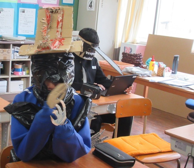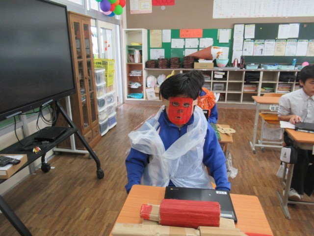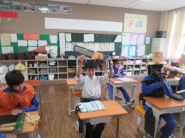 F組の1時間目の様子です。朝からハロウィン全開です!みんな自分で製作した衣装を着ていました。担任の先生はサザエさんさんに!もう一人の担任の先生は、写真には撮れませんでしたが、ドラゴンズの野球のユニフォームを着ていました。これは生徒の企画で始まったイベントだそうです。飾りつけも工夫されていて、楽しさいっぱいでした。🎃🎃🎃