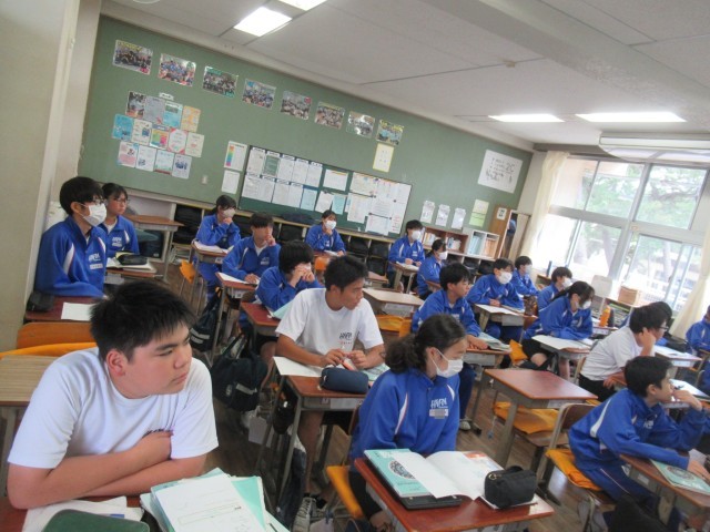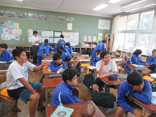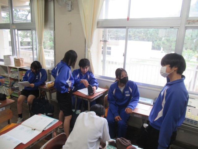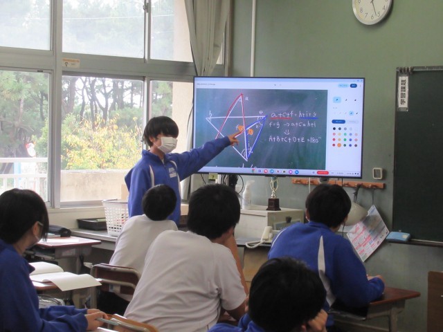 2C 数学 星形(多角形)の∠aから∠eまで全て足すと180°になることを、どのように証明したらよいか考えているところでした。1枚目の写真は、自分の考えを紹介している場面です。
