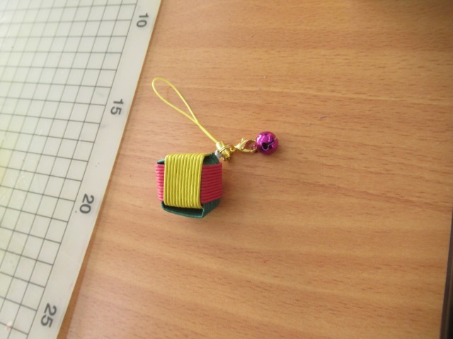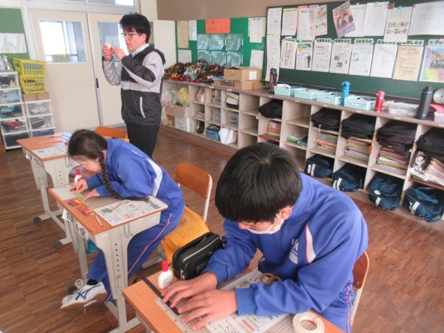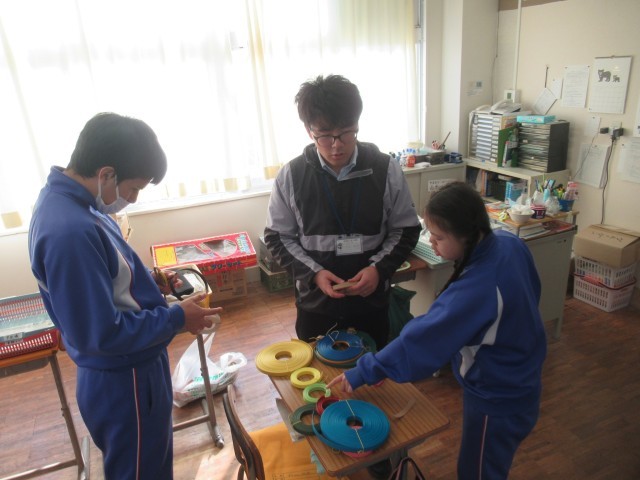 F組 5・6時間目は講師の先生をお招きし、紙バンドを使った「キューブ型ストラップ」の制作に取り組みました。3色の紙バンドを選び、8センチにカットし…手順を確認しながら丁寧作業を進めていました。かわいらしいストラップの完成です!