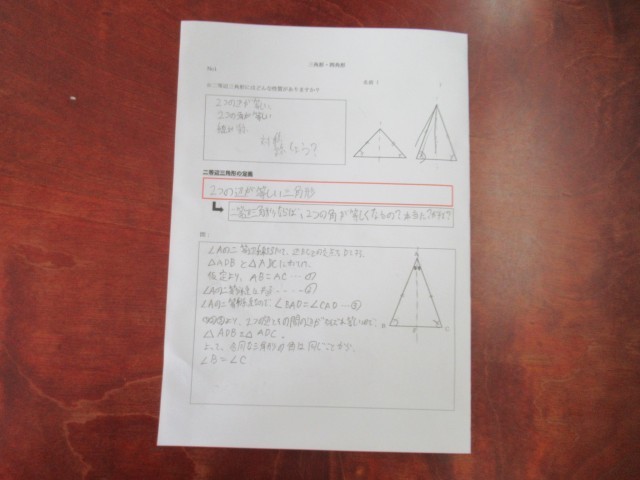 2C 数学 「二等辺三角形ならば、二つの角が等しくなるのは本当か?」これを解明しているところでした。