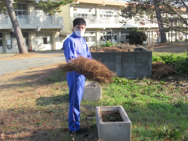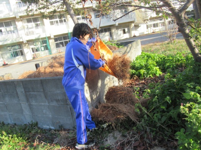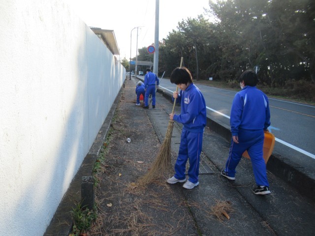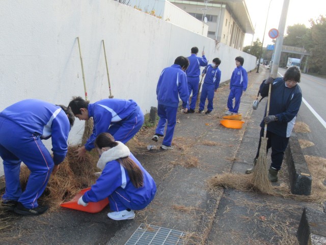本日1時間目、F組のみんなで学校南側の歩道をきれいにしました。歩道には海岸の松葉が驚くほどたまっていましたが、「歩く人が困らないように」「学校周辺をきれいに」という思いで一生懸命に作業に励みました。地域のために、皆のためにと熱心に取り組む姿が印象的でした。ありがとう!