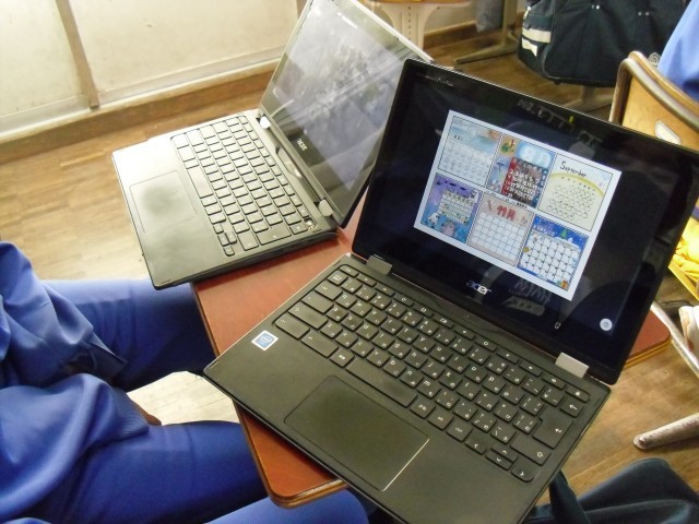 3A 美術 クラスのみんなで作成した、各月のカレンダーを編集していました。素敵なカレンダーができそうです。