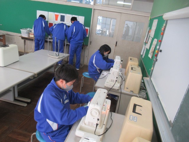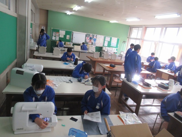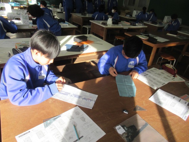 1C 家庭 「ティッシュカバーの製作」です。今日は「袋口を三つ折りし、まつり縫いをする」ところまでを目標に作業を進めていました。