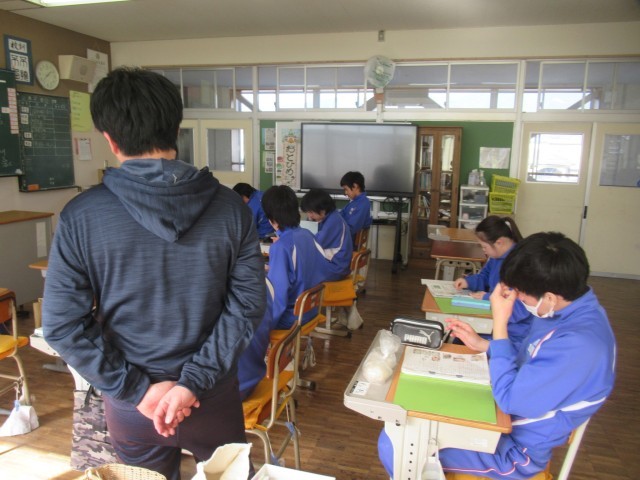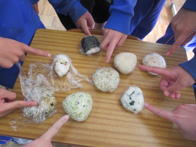 F組 3・4時間目に実施した調理実習の振り返りをしていました。3枚目の写真は、各自が作ったおにぎりです。おいしそうですね!
