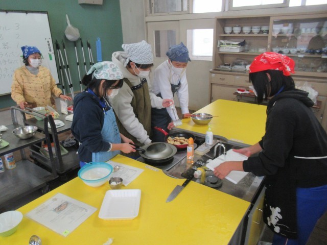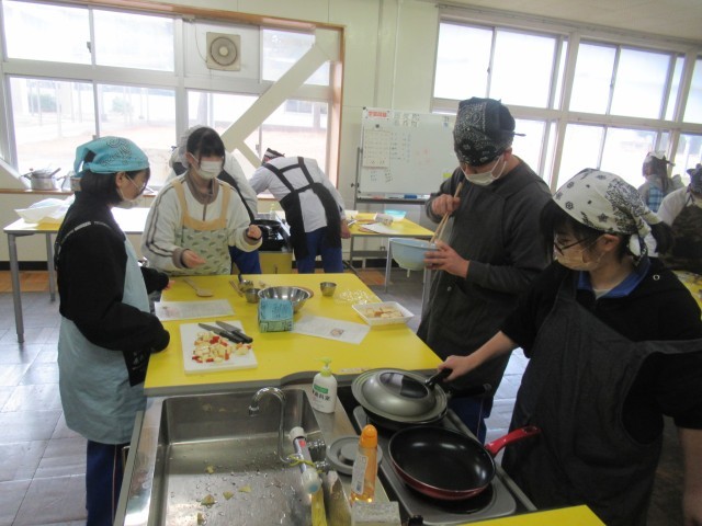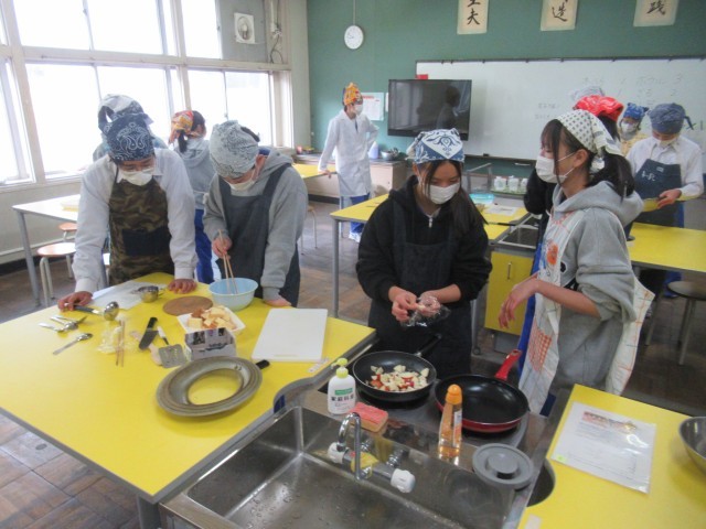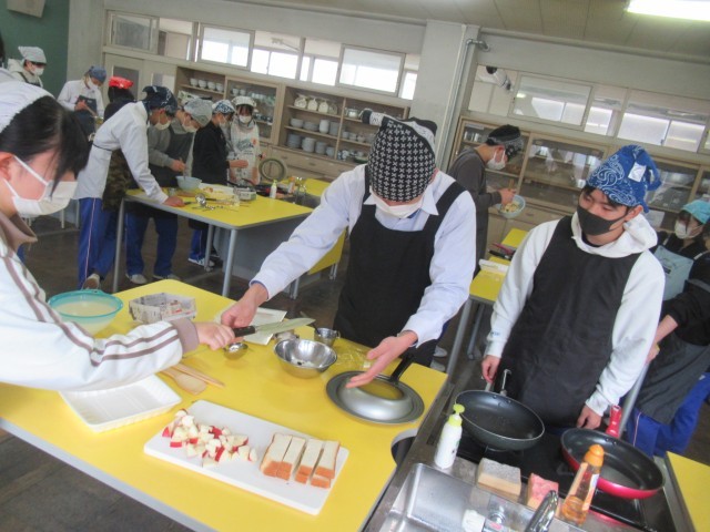 3D 家庭 「アップル蒸しパン」の調理実習をしているところでした。手際よく調理していました。おいしくできたかな?