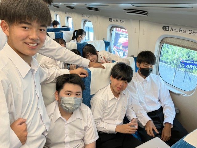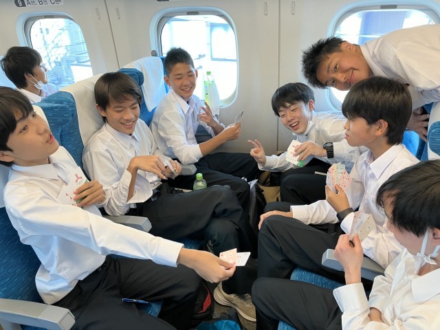 名古屋に到着しました。トランプやUNOをして、新幹線内を楽しんでいます。