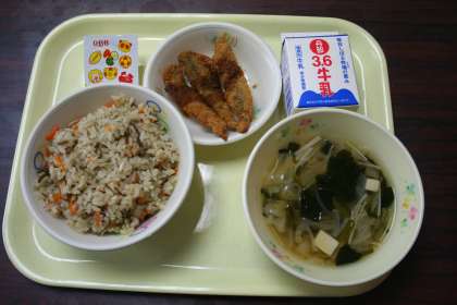クープジューシー、牛乳、小イワシフライ、野菜スープ、型抜きチーズです。