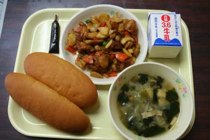 ロールパン、牛乳、鶏肉とジャガイモの揚げ煮、ベーコンとキャベツのスープでした。