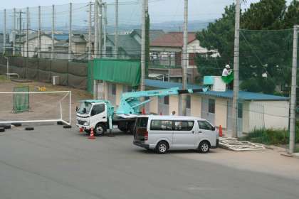 グランド北に設置されている防砂ネットが破けていて、だらしのない状態だったので、修繕要望を出しておいたところ、管理課で手配いただき修繕が始まりました。綺麗な状態で潮騒祭を迎えられます。ありがたいことです。