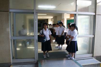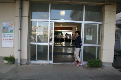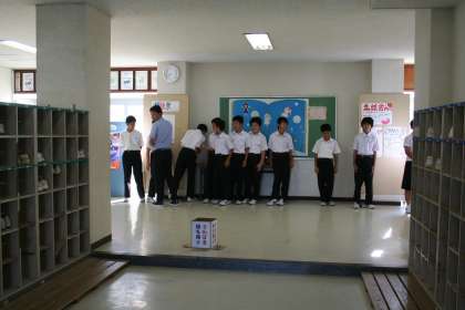 学級別あいさつ運動(1年)です。1年生は、1,3年生が利用している生徒玄関で実施していました。