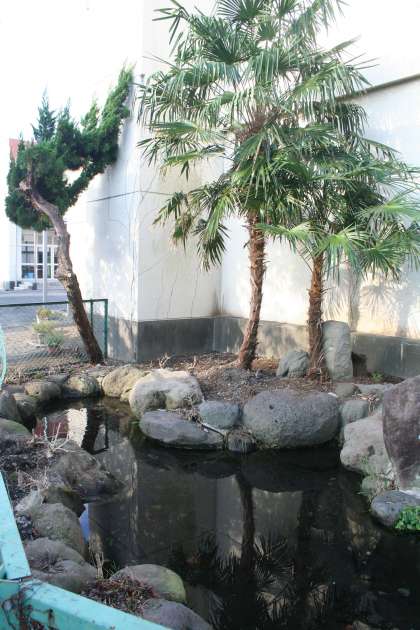 学校の校地内に池が二つあります。中庭と東門の北にあります。この池は雑草が生い茂り、空き缶やビニール袋が投げ捨てられていて、汚い状態でした。手伝ってくれる生徒がいるので、片付けを始めました。防火用水の役目をしているので、生き物はいませんが、日本庭園風にして、憩いの場にしたいと思います。