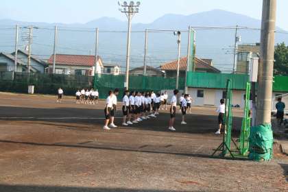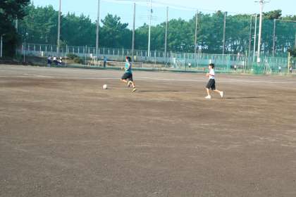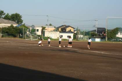 応援団の朝練、その横で、サッカー部も朝練をやっていました。先生も一緒に汗をかいていました。