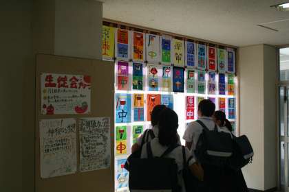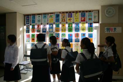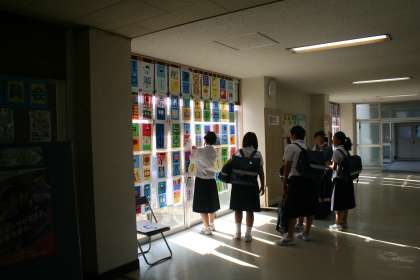 1年生の生徒たちが下駄箱の所に集まって、なにやら上を見上げているので、尋ねると、「夏休みの宿題のポスター展示です。」と教えてくれました。