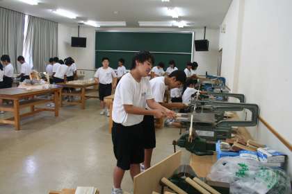 授業風景(1年C組技術科)です。木工作品の作成中で、のこぎりの使い方を学習中でした。