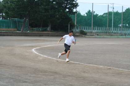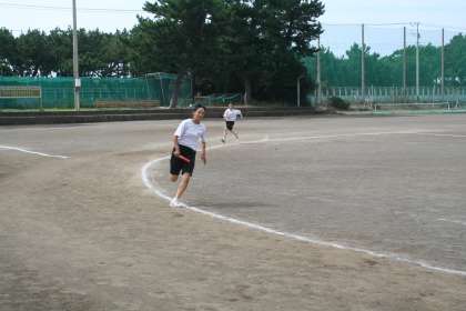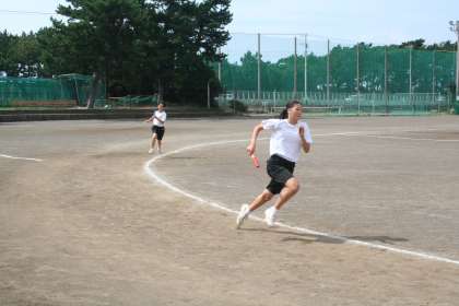 授業風景(体育)2年E組対3年A組です。外へ出て、校地内整備に向かうところで、リレー対決をやっていたので撮影しました。