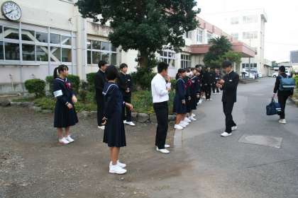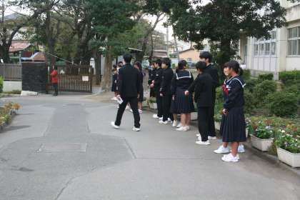 週明けの朝です。今日は、3年C、D組があいさつ当番の日でした。