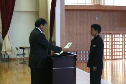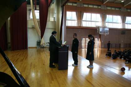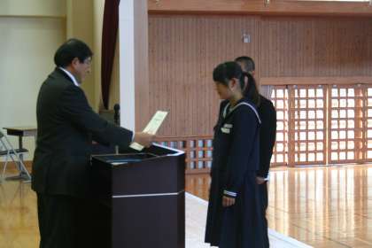 生徒集会の前に、部活動のスポーツ祭等の表彰がありました。陸上競技部では、砲丸投げ男子で山本君が優勝、女子では原さんが3位に入りました。サッカー部は、浮島中との合同チームで3位になりました。