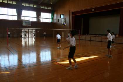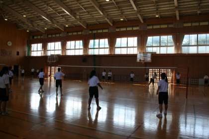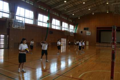 授業風景(2年C組)体育です。体育館でバレーボールのサーブ練習をしていました。