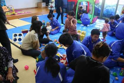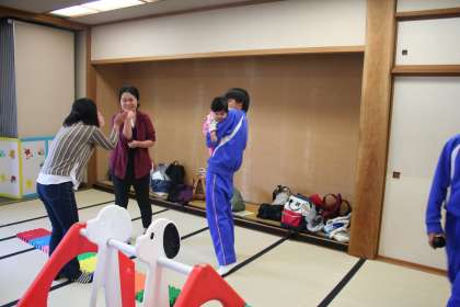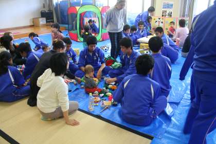 2時間目は、家庭科保育体験(3年E組)がありました。原地区センターまで行って、乳幼児が集まる「ぴよぴよ」へお邪魔しました。もう交流が始まっていて、幼児たちも、お兄さんお姉さんになれてきたようです。上手にだっこしている男子がいました。