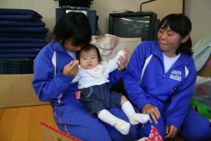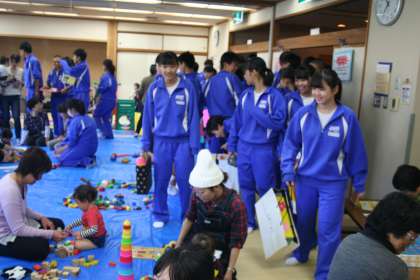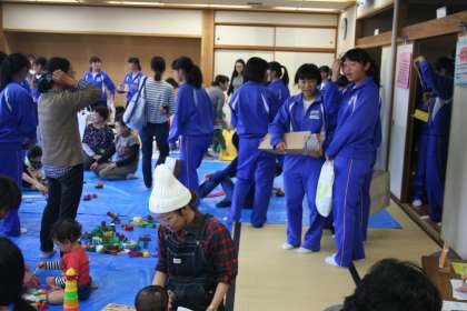 3時間目は、家庭科保育体験(3年A・B組)です。原地区センターに到着した生徒たち、一瞬、どうしていいか迷っていましたが、徐々に親子に接近して話しかけ始めました。。