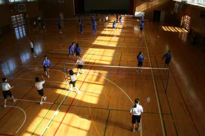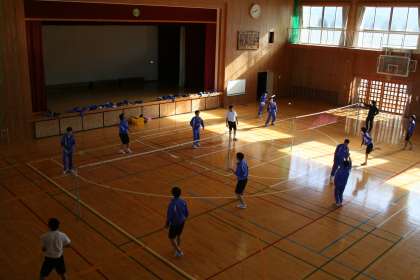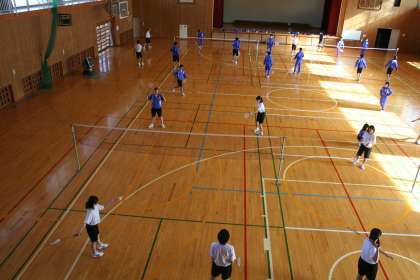 授業風景(3年D組)体育です。体育館フロアーでは、3年生が体育でバトミントンをやっていました。