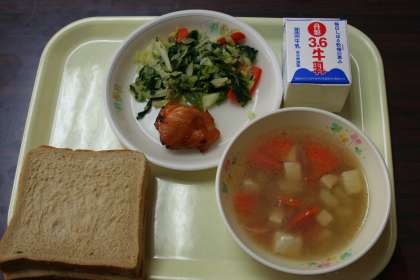 黒糖食パン、牛乳、鶏肉のチリソース焼き、ほうれん草とパプリカのソテー、野菜スープでした。