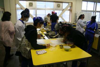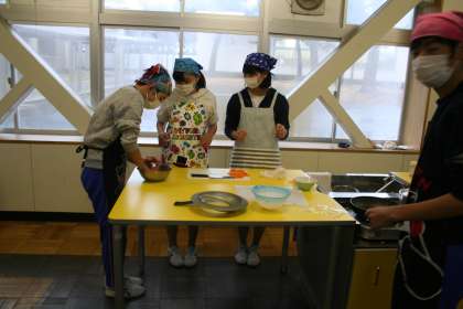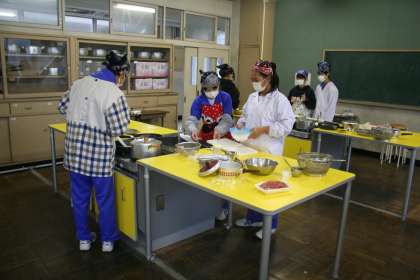 授業風景(2年C組)調理実習です。昨日も、2年生の他のクラスが調理実習をしていて、廊下にいいにおいが漂っていました。今日は2Cがハンバーグをつくっていました。