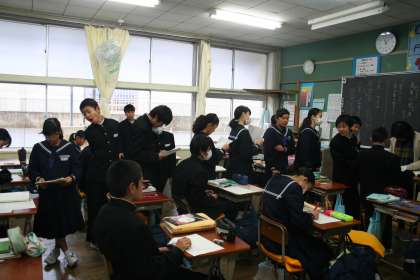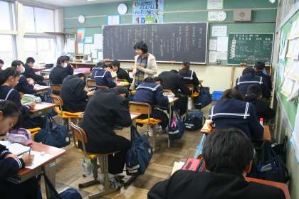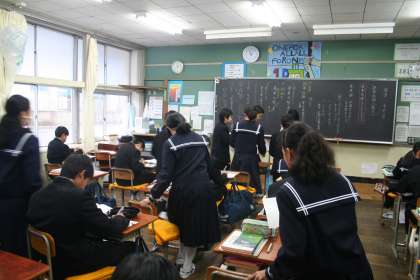 授業風景(1年D組)です。故事成語などを学習した後、漢文の返り点の学習をしていました。練習プリントをできた生徒たちが並んでいます。