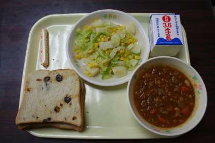 レーズン角食パン、牛乳、チリコンカン、ポテトとコーンのサラダ、スティックチーズでした。