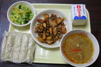 中華麺、牛乳、味噌ラーメン、サツマイモとアーモンドの揚げ煮、ブロッコリーのサラダでした。