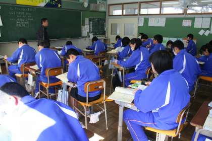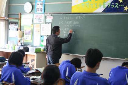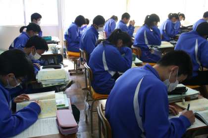 授業風景(2年E組)です。社会の授業でした。東京の千代田区を勉強していました。地図から色々なことが読めるんですね。