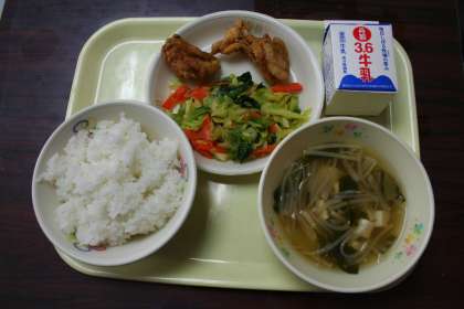 ご飯、牛乳、鶏肉の唐揚げ、野菜のオイスターソース炒め、中華スープでした。