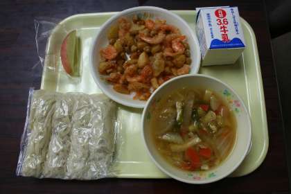 ちゃんこうどん、牛乳、小エビとポテトの唐揚げ、チルドりんごでした。