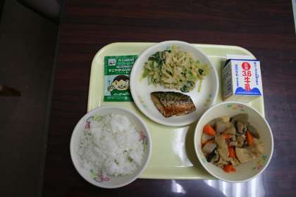 ご飯、牛乳、鯖の照り焼き、ごま和え、筑前煮、のりのふりかけでした。